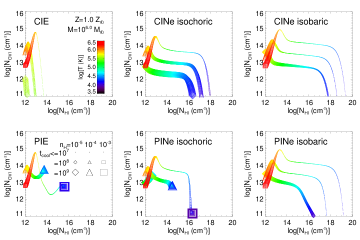 OVI column density plotted against NHI for radiatively cooling gases for CIE, CINe isochoric, CINe isobaric, PIE, PINe isochoric, and PINe isobaric. The z=0.2 HM01 EGB is assumed for photo-ionised cases. The gas is assumed to be solar metallicity and the cloud mass is 106 solar masses. Colour indicates temperature, symbol shape indicates density, and symbol size indicates cooling time. A cooling gas will spend more time where the symbol is large, meaning that many of the strong OVI columns at intermediate temperatures (105-106 K) are short-lived.