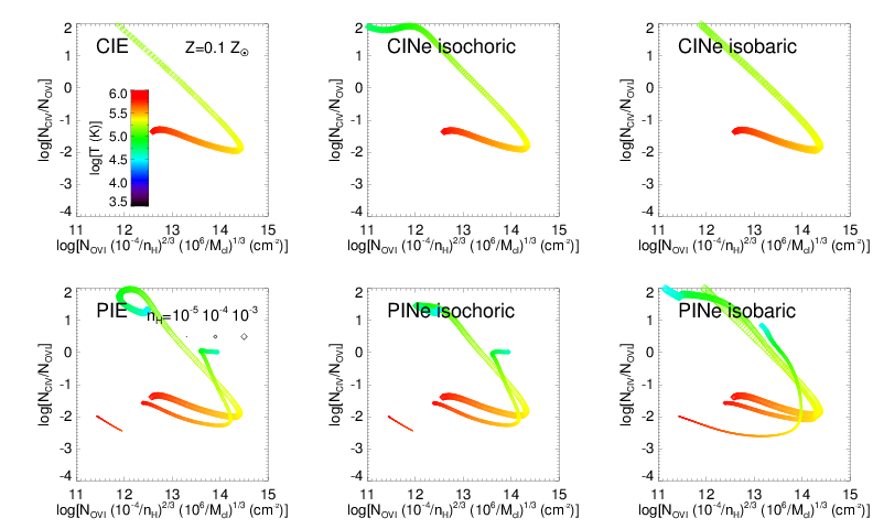 Identical to the previous plot, except now for 0.1 solar metallicity. Note that cooling times at the lowest densities exceed a Hubble time, so they do not show complete cooling tracks to the equilibrium temperature, except for the isobaric case.