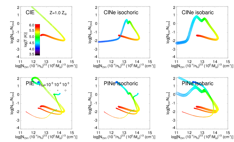 Similar to the previous plot on the website, but showing the CIV/OVI ratio as a function of NOVI. Solar metallicity is assumed. Three different number densities are shown for photo-ionised cases assuming the z=1 HM01 EGB. The column densities assume a line of sight through the centre of a spherical cloud with Mcl.