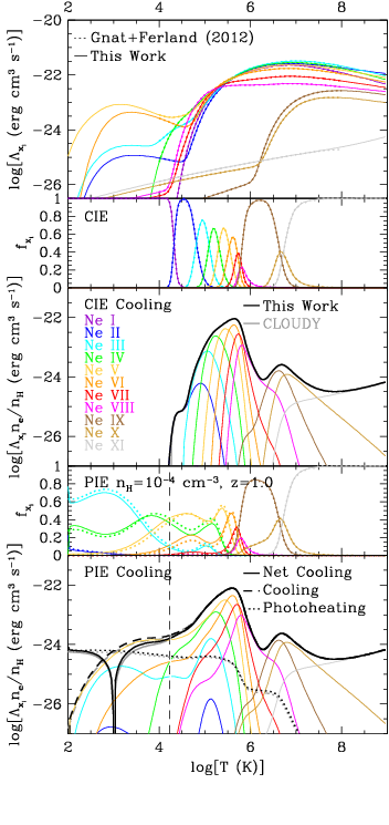 An analogous plot to Figure 3 in the paper, which shows oxygen ion-by-ion cooling and photo-heating, but here for the 11 neon ions in solar abundance gas. See the caption in the paper, or for the analogous primordial plot on this website for a description. The agreement with CLOUDY for neon is outstanding.