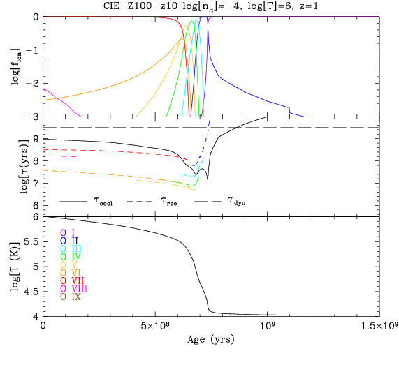 A time history diagnostic plot showing the evolution of oxygen states (top panel) for the collisional ionisation equilibrium (CIE) case starting at T=106 K at t=0 for nH=10-4 cm-3, solar enriched gas. The middle panel shows timescales including the recombination timescales of various oxygen ions (in colour), the cooling timescale, and the dynamical timescale. The bottom shows the temperature history. The CIE case rapidly cools resulting in oxygen recombining from O VIII to O I very rapidly. This figure is meant to be compared and contrasted with the next four figures here on the website.