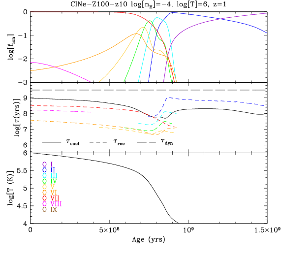 A time history diagnostic plot showing the evolution of oxygen states (top panel) for the collisional ionisation non-equilibrium (CINe isochoric) case starting at T=106 K at t=0 for nH=10-4 cm-3, solar enriched gas. The middle panel shows timescales including the recombination timescales of various oxygen ions (in colour), the cooling timescale, and the dynamical timescale. The bottom shows the temperature history. The CINe cases were the subject of Gnat & Sternberg (2007) who showed recombination timescales in excess of the cooling timescale significantly reduced cooling in the gas and created ionisation lags. This figure is meant to be compared and contrasted with the adjacent four figures here on the website.