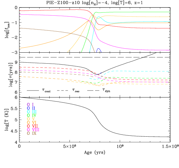 A time history diagnostic plot showing the evolution of oxygen states (top panel) for the photo-ionisation equilibrium (PIE) case starting at T=106 K at t=0 for nH=10-4 cm-3, solar enriched gas under a z=1 Haardt & Madau (2001) background. The middle panel shows timescales including the recombination timescales of various oxygen ions (in colour), the cooling timescale, and the dynamical timescale. The bottom shows the temperature history. The PIE (isochoric) case asymptotes to a T~104 K equilibrium temperature where O IV is the dominant species. This figure is meant to be compared and contrasted with the adjacent four figures here on the website.
